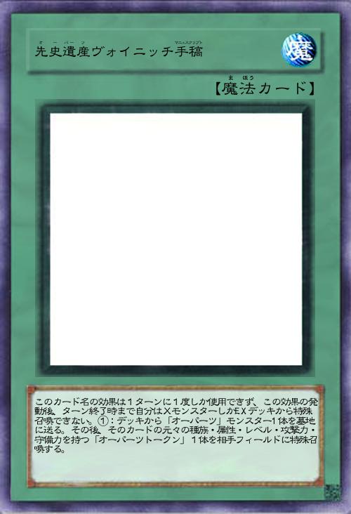 | このカード名の効果は1ターンに1度しか使用できず、この効果の発動後、ターン終了時まで自分はXモンスターしかEXデッキから特殊召喚できない。①:デッキから「オーパーツ」モンスター1体を墓地に送る。その後、そのカードの元々の種族・属性・レベル・攻撃力・守備力を持つ「オーパーツトークン」1体を相手フィールドに特殊召喚する。 | |||