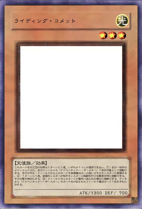 | このカード名の①③の効果は1ターンに1度、いずれか1つしか使用できない。①:自分・相手のメインフェイズに、自分フィールドの「アドベンチャラー・ザ・スター」1体を対象として発動できる。自分の手札・フィールドからこのカードを装備魔法カード扱いでそのモンスターに装備する。②:1ターンに1度、装備モンスターが相手モンスターと戦闘を行う攻撃宣言時に発動できる。その攻撃を無効にする。③:フィールドのこのカードが墓地へ送られた場合に発動できる。デッキから「アドベンチャラー・ザ・スター」のカード名が記されたフィールド魔法カード1枚を手札に加える。 | |||