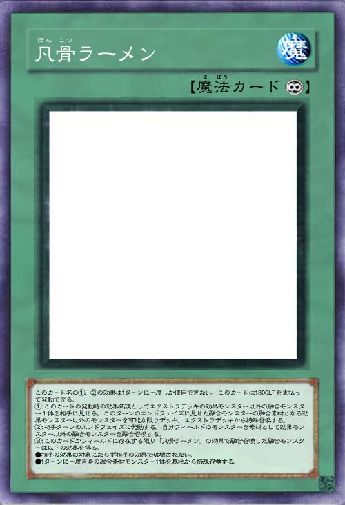 | このカード名の①、②の効果は1ターンに一度しか使用できない。このカードは1800LPを支払って発動できる。 ①:このカードの発動時の効果処理としてエクストラデッキの効果モンスター以外の融合モンスター1体を相手に見せる。このターンのエンドフェイズに見せた融合モンスターの融合素材となる効果モンスター以外のモンスターを可能な限りデッキ、エクストラデッキから特殊召喚する。 ②:相手ターンのエンドフェイズに発動する。自分フィールドのモンスターを素材として効果モンスター以外の融合モンスターを融合召喚する。 ③:このカードがフィールドに存在する限り「凡骨ラーメン」の効果で融合召喚した融合モンスターは以下の効果を得る。 ●相手の効果の対象にならず相手の効果で破壊されない。 ●1ターンに一度自身の融合素材モンスター1体を墓地から特殊召喚する。 | |||
