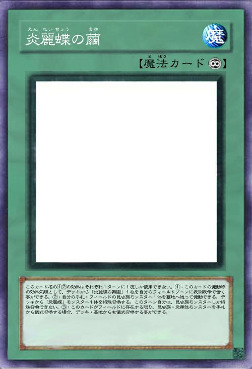 | このカード名の①②の効果はそれぞれ1ターンに1度しか使用できない。①:このカードの発動時の効果処理として、デッキから「炎麗蝶の舞園」1枚を自分のフィールドゾーンに表側表示で置く事ができる。②:自分の手札・フィールドの昆虫族モンスター1体を墓地へ送って発動できる。デッキから「炎麗蝶」モンスター1体を特殊召喚する。このターン自分は、昆虫族モンスターしか特殊召喚できない。③:このカードがフィールドに存在する限り、昆虫族・炎属性モンスターを手札から儀式召喚する場合、デッキ・墓地からも儀式召喚する事ができる。 | |||