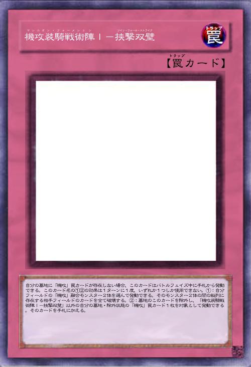 | 自分の墓地に「機攻」罠カードが存在しない場合、このカードはバトルフェイズ中に手札から発動できる。このカード名の①②の効果は1ターンに1度、いずれか1つしか使用できない。①:自分フィールドの「機攻」融合モンスター2体を選んで発動できる。そのモンスター2体の間の縦列に存在する相手フィールドのカードを全て破壊する。②:墓地のこのカードを除外し、「機攻装騎戦術陣Ⅰ-挟撃双璧」以外の自分の墓地・除外状態の「機攻」罠カード1枚を対象として発動できる。そのカードを手札に加える。 | |||