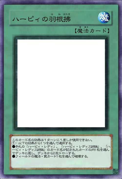 | このカード名の効果は1ターンに1度しか使用できない。 ①:以下の効果から1つを選んで適用する。 ●手札の「ハーピィ・レディ」、「ハーピィ・レディ三姉妹」、「ハーピィ・レディ三姉妹」のカード名が記されたカードの内1枚を選んでデッキに戻し、デッキから2枚ドローする。 ●フィールドの魔法・罠カード1枚を選んで破壊する。 | |||