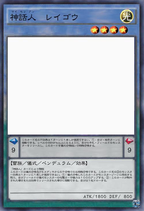 | 「神話人」カードにより降臨 このカードは儀式召喚及びEXデッキからのP召喚でのみ特殊召喚できる。このカード名の②のモンスター効果は1ターンに1度しか使用できない。①:儀式召喚したこのカードがモンスターゾーンに存在する限り、自分フィールドの儀式モンスターの攻撃力・守備力は1000アップする。②:このカードが除外された場合または効果でリリースされた場合に発動できる。自分は1枚ドローする。 | |||