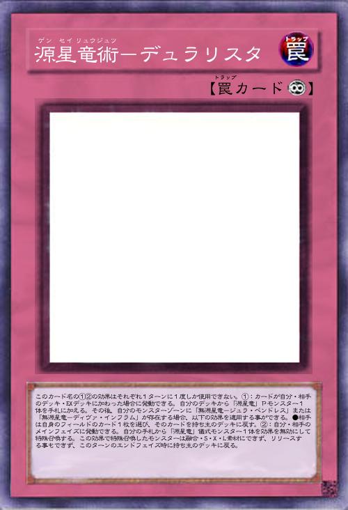 | このカード名の①②の効果はそれぞれ1ターンに1度しか使用できない。①:カードが自分・相手のデッキ・EXデッキに加わった場合に発動できる。自分のデッキから「源星竜」Pモンスター1体を手札に加える。その後、自分のモンスターゾーンに「無源星竜-ジュラ・ペンドレス」または「無源星竜-ディヴァ・インフラム」が存在する場合、以下の効果を適用する事ができる。●相手は自身のフィールドのカード1枚を選び、そのカードを持ち主のデッキに戻す。②:自分・相手のメインフェイズに発動できる。自分の手札から「源星竜」儀式モンスター1体を効果を無効にして特殊召喚する。この効果で特殊召喚したモンスターは融合・S・X・L素材にできず、リリースする事もできず、このターンのエンドフェイズ時に持ち主のデッキに戻る。 | |||
