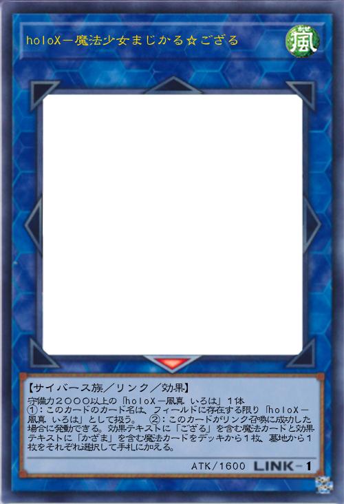 | 守備力2000以上の「holoX-風真 いろは」1体 ①:このカードのカード名は、フィールドに存在する限り「holoX-風真 いろは」として扱う。 ②:このカードがリンク召喚に成功した場合に発動できる。効果テキストに「ござる」を含む魔法カードと効果テキストに「かざま」を含む魔法カードをデッキから1枚、墓地から1枚をそれぞれ選択して手札に加える。 | |||