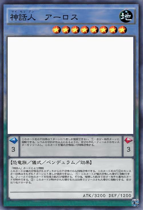 | 「神話人」カードにより降臨 このカードは儀式召喚及びEXデッキからのP召喚でのみ特殊召喚できる。このカード名の①②のモンスター効果はそれぞれ1ターンに1度しか使用できない。 ①:このカードが儀式召喚した場合に発動できる。フィールドの他のカードを任意の数だけ破壊する。その後、破壊した数まで自分・相手の墓地のカードを除外できる。②:このカードが除外された場合または効果でリリースされた場合に発動できる。自分は1枚ドローする。 | |||