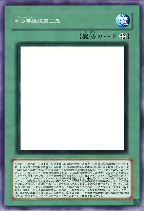 | このカード名のカードは1ターンに1枚しか発動できず、このカード名の②⑤の効果はそれぞれ1ターンに1度しか使用できない。このカードの④の効果でLPが40000以上になったプレイヤーはデュエルに勝利する。①:このカードの発動時の効果処理として、手札・デッキから「ガーデンコンペ」モンスター1体を特殊召喚できる。この効果で特殊召喚した場合、このターン自分はこのカードの効果以外でモンスターを特殊召喚できない。②:自分メインフェイズ及び相手スタンバイフェイズに、ターンプレイヤーは以下の効果を発動できる。●お互いのフィールドに「食べ物トークン」(植物族・光・星6・攻/守2000)を可能な限り守備表示で特殊召喚する。この効果を発動するターン、自分はこのカードの効果以外でモンスターを特殊召喚できない。③:フィールドの「食べ物トークン」が破壊される度に、1体につき1つこのカードにカウンターを置く。④:お互いのエンドフェイズに発動する。このカードのカウンターを全て取り除き、ターンプレイヤーは、取り除いた数×1000LP回復する。⑤:このカードが破壊され墓地へ送られた場合に発動できる。デッキから「アドベンチャラー・ザ・スター」1体を手札に加える。 | |||
