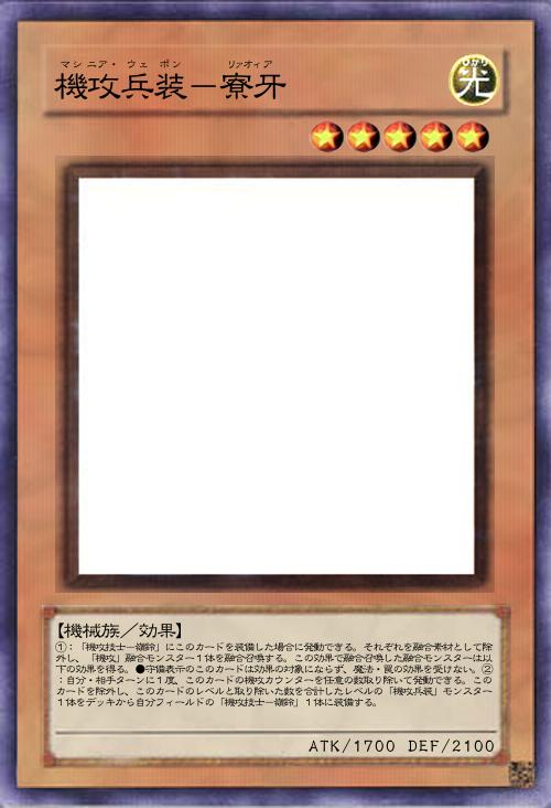 | ①:「機攻技士-嶺鈴」にこのカードを装備した場合に発動できる。それぞれを融合素材として除外し、「機攻」融合モンスター1体を融合召喚する。この効果で融合召喚した融合モンスターは以下の効果を得る。●守備表示のこのカードは効果の対象にならず、魔法・罠の効果を受けない。②:自分・相手ターンに1度、このカードの機攻カウンターを任意の数取り除いて発動できる。このカードを除外し、このカードのレベルと取り除いた数を合計したレベルの「機攻兵装」モンスター1体をデッキから自分フィールドの「機攻技士-嶺鈴」1体に装備する。 | |||