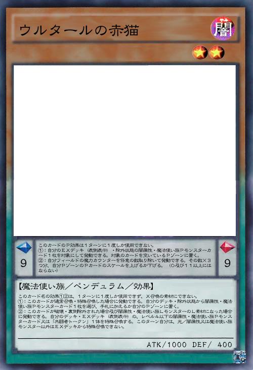| このカード名の効果①②は、1ターンに1度しか使用できず、X召喚の素材にできない。 ①:このカードが通常召喚・特殊召喚した場合に発動できる。自分のデッキ・除外状態から闇属性・魔法使い族Pモンスターカード1枚を選び、手札に加えるか自分のPゾーンに置く。 ②:このカードが破壊・裏側除外された場合及び闇属性・魔法使い族LモンスターのL素材になった場合に発動できる。自分のデッキ・EXデッキ(表側表示)の、レベル4以下の闇属性・魔法使い族Pモンスターカード又は「共闘者トークン」1体を特殊召喚する。このターン自分は、光/闇属性又は魔法使い族モンスター以外はEXデッキから特殊召喚できない。 | |||