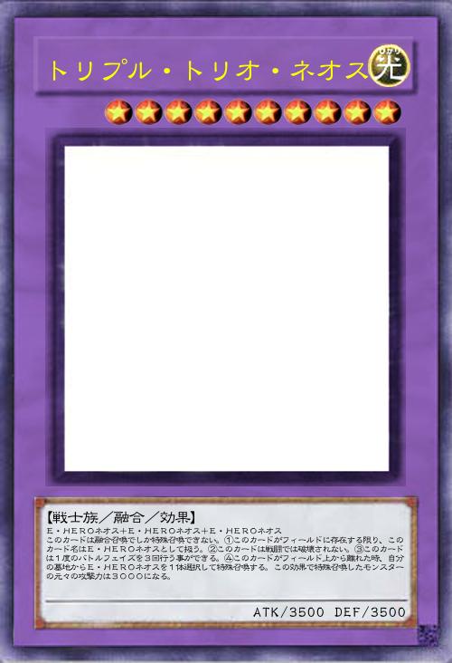 | E・HEROネオス+E・HEROネオス+E・HEROネオス このカードは融合召喚でしか特殊召喚できない。①このカードがフィールドに存在する限り、このカード名はE・HEROネオスとして扱う。②このカードは戦闘では破壊されない。③このカードは1度のバトルフェイズを3回行う事ができる。④このカードがフィールド上から離れた時、自分の墓地からE・HEROネオスを1体選択して特殊召喚する。この効果で特殊召喚したモンスターの元々の攻撃力は3000になる。 | |||