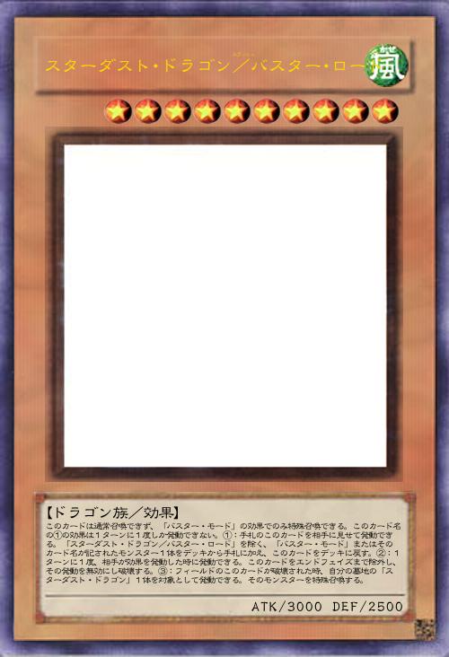 | このカードは通常召喚できず、「バスター・モード」の効果でのみ特殊召喚できる。このカード名の①の効果は1ターンに1度しか発動できない。①:手札のこのカードを相手に見せて発動でき る。「スターダスト・ドラゴン/バスター・ロード」を除く、「バスター・モード」またはその カード名が記されたモンスター1体をデッキから手札に加え、このカードをデッキに戻す。②:1ターンに1度、相手が効果を発動した時に発動できる。このカードをエンドフェイズまで除外し、その発動を無効にし破壊する。③:フィールドのこのカードが破壊された時、自分の墓地の「ス ターダスト・ドラゴン」1体を対象として発動できる。そのモンスターを特殊召喚する。 | |||