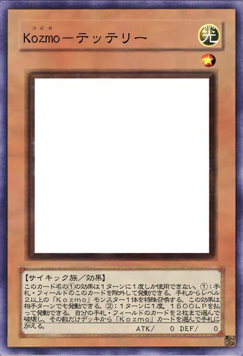 | このカード名の①の効果は1ターンに1度しか使用できない。①:手札・フィールドのこのカードを除外して発動できる。手札からレベル2以上の「Kozmo」モンスター1体を特殊召喚する。この効果は相手ターンでも発動できる。②:1ターンに1度、1500LPを払って発動できる。自分の手札・フィールドのカードを2枚まで選んで破壊し、その数だけデッキから「Kozmo」カードを選んで手札に加える。 | |||