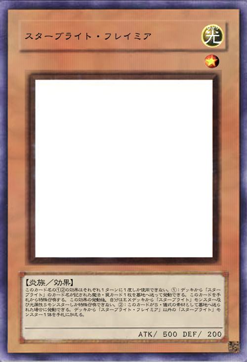 | このカード名の①②の効果はそれぞれ1ターンに1度しか使用できない。①:デッキから「スターブライト」のカード名が記された魔法・罠カード1枚を墓地へ送って発動できる。このカードを手札から特殊召喚する。この効果の発動後、自分はEXデッキから「スターブライト」モンスター及び光属性Sモンスターしか特殊召喚できない。②:このカードがS・儀式の素材として墓地へ送られた場合に発動できる。デッキから「スターブライト・フレイミア」以外の「スターブライト」モンスター1体を手札に加える。 | |||