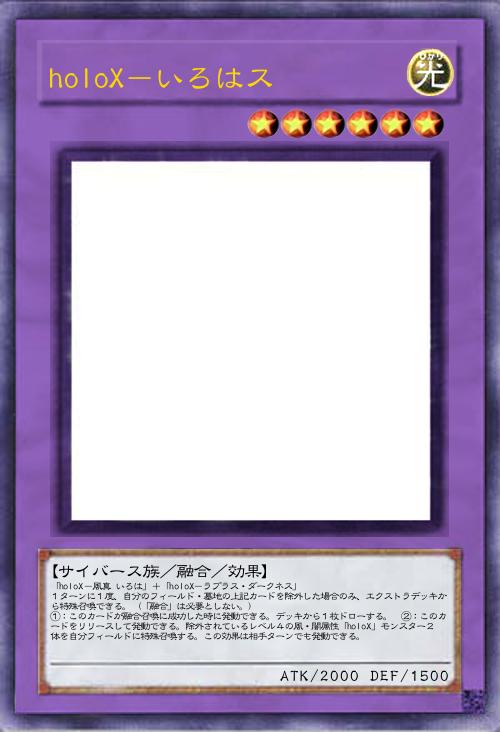 | 「holoX-風真 いろは」+「holoX-ラプラス・ダークネス」 自分のフィールド・墓地の上記カードを除外した場合のみ、エクストラデッキから特殊召喚できる。(「融合」は必要としない。) 自分は「holoX-いろはス」を1ターンに1度しか特殊召喚できない。 ①:このカードが融合召喚に成功した時に発動できる。デッキから1枚ドローする。 ②:このカードをリリースして発動できる。除外されているレベル4の風・闇属性「holoX」モンスター2体を自分フィールドに特殊召喚する。この効果は相手ターンでも発動できる。 | |||