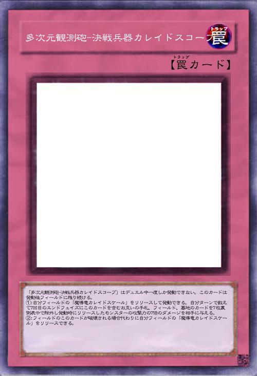 | 「多次元観測砲-決戦兵器カレイドスコープ」はデュエル中一度しか発動できない。このカードは発動後フィールドに残り続ける。 ①:自分フィールドの「魔導竜カレイドスケール」をリリースして発動できる。自分ターンで数えて7回目のエンドフェイズにこのカードを含むお互いの手札、フィールド、墓地のカードを7枚裏側表示で除外し発動時にリリースしたモンスターの攻撃力の7倍のダメージを相手に与える。 ②:フィールドのこのカードが破壊される場合代わりに自分フィールドの「魔導竜カレイドスケール」をリリースできる。 | |||