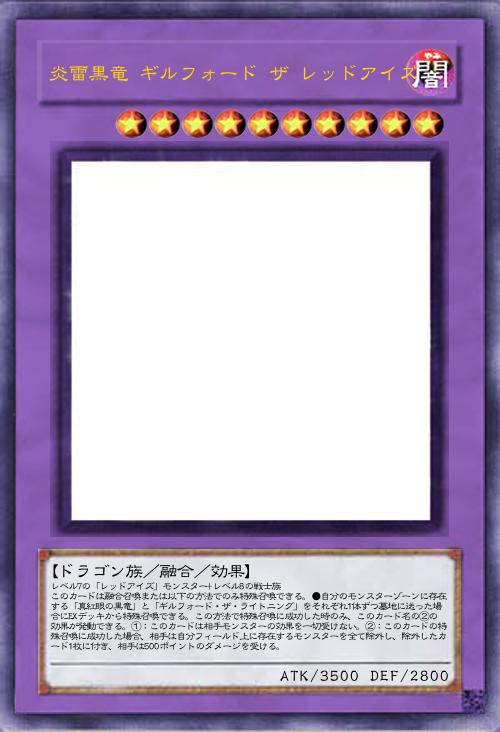 | レベル7の「レッドアイズ」モンスター+レベル8の戦士族 このカードは融合召喚または以下の方法でのみ特殊召喚できる。●自分のモンスターゾーンに存在する「真紅眼の黒竜」と「ギルフォード・ザ・ライトニング」をそれぞれ1体ずつ墓地に送った場合にEXデッキから特殊召喚できる。この方法で特殊召喚に成功した時のみ、このカード名の②の効果が発動できる。①:このカードは相手モンスターの効果を一切受けない。②:このカードの特殊召喚に成功した場合、相手は自分フィールド上に存在するモンスターを全て除外し、除外したカード1枚に付き、相手は500ポイントのダメージを受ける。 | |||