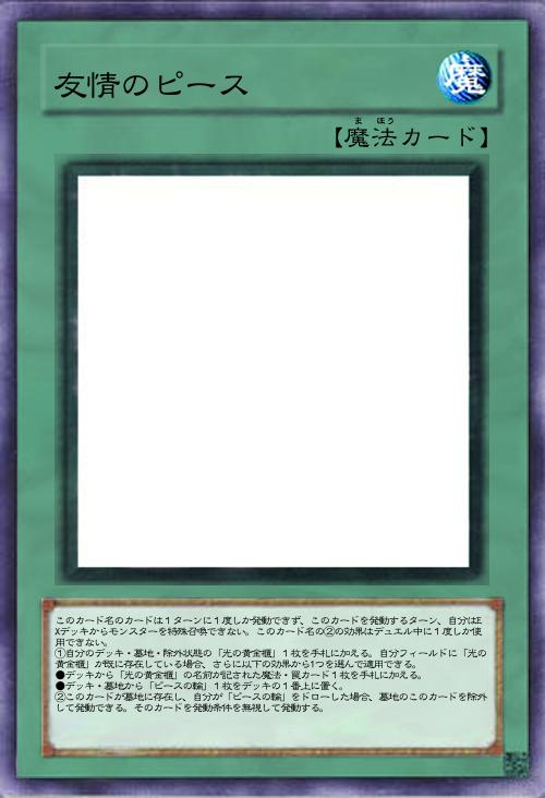 | このカード名のカードは1ターンに1度しか発動できず、このカードを発動するターン、自分はEXデッキからモンスターを特殊召喚できない。このカード名の②の効果はデュエル中に1度しか使用できない。 ①自分のデッキ・墓地・除外状態の「光の黄金櫃」1枚を手札に加える。自分フィールドに「光の黄金櫃」が既に存在している場合、さらに以下の効果から1つを選んで適用できる。 ●デッキから「光の黄金櫃」の名前が記された魔法・罠カード1枚を手札に加える。 ●デッキ・墓地から「ピースの輪」1枚をデッキの1番上に置く。 ②このカードが墓地に存在し、自分が「ピースの輪」をドローした場合、墓地のこのカードを除外して発動できる。そのカードを発動条件を無視して発動する。 | |||