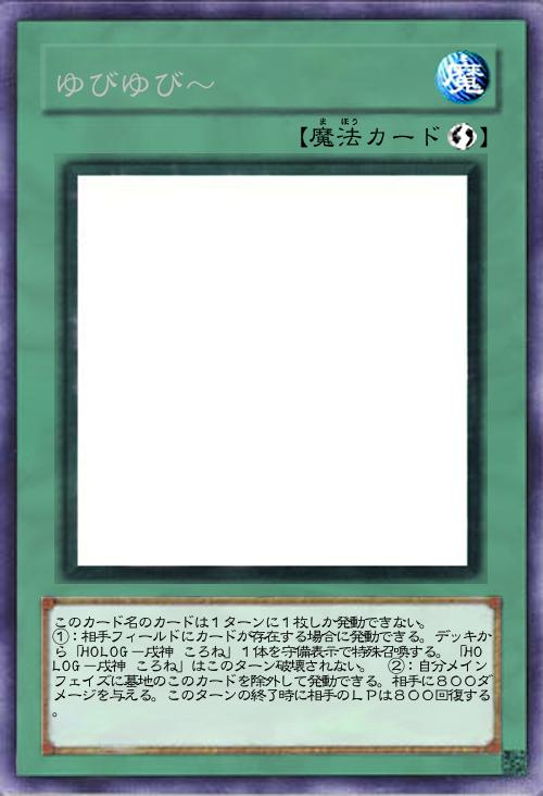 | このカード名のカードは1ターンに1枚しか発動できない。 ①:相手フィールドにカードが存在する場合に発動できる。デッキから「HOLOG-戌神 ころね」1体を守備表示で特殊召喚する。「HOLOG-戌神 ころね」はこのターン破壊されない。 ②:自分メインフェイズに墓地のこのカードを除外して発動できる。相手に800ダメージを与える。このターンの終了時に相手のLPは800回復する。 | |||