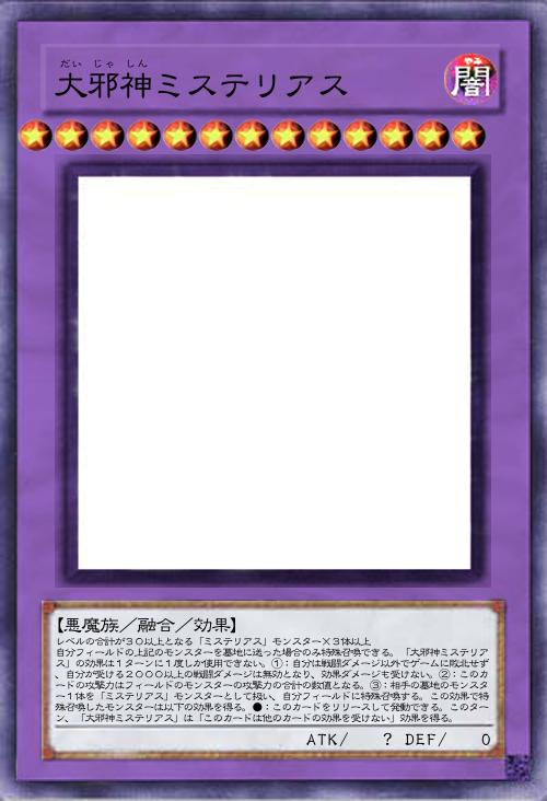 | レベルの合計が30以上となる「ミステリアス」モンスター×3体以上 自分フィールドの上記のモンスターを墓地に送った場合のみ特殊召喚できる。「大邪神ミステリアス」の効果は1ターンに1度しか使用できない。①:自分は戦闘ダメージ以外でゲームに敗北せず、自分が受ける2000以上の戦闘ダメージは無効となり、効果ダメージも受けない。②:このカードの攻撃力はフィールドのモンスターの攻撃力の合計の数値となる。③:相手の墓地のモンスター1体を「ミステリアス」モンスターとして扱い、自分フィールドに特殊召喚する。この効果で特殊召喚したモンスターは以下の効果を得る。●:このカードをリリースして発動できる。このターン、「大邪神ミステリアス」は「このカードは他のカードの効果を受けない」効果を得る。 | |||
