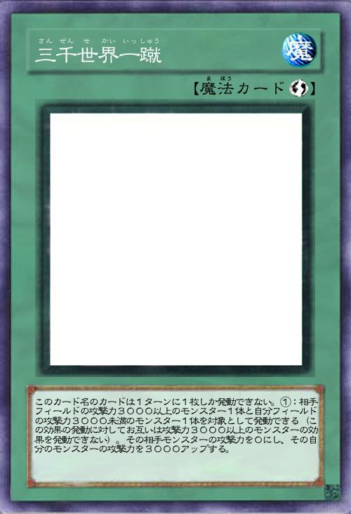 | このカード名のカードは1ターンに1枚しか発動できない。①:相手フィールドの攻撃力3000以上のモンスター1体と自分フィールドの攻撃力3000未満のモンスター1体を対象として発動できる(この効果の発動に対してお互いは攻撃力3000以上のモンスターの効果を発動できない)。その相手モンスターの攻撃力を0にし、その自分のモンスターの攻撃力を3000アップする。 | |||