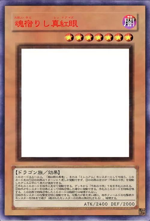 | このカードはルール上、「真紅眼の黒竜」、または「ミレニアム」モンスターとしても扱う。このカード名の①②の効果は1ターンに1度しか発動できず、③の効果は自分が「千年の十字」を発動したデュエル中に1度だけ使用できる。 ①手札のこのカードを相手に見せて発動できる。デッキから「千年の十字」1枚を手札に加える。 ②相手がモンスターを効果によって特殊召喚した場合に発動できる。手札のこのカードを特殊召喚する。この効果で特殊召喚したこのカードは戦闘では破壊されない。 ③相手モンスターの攻撃宣言時に発動できる。攻撃力が最も高い順に、相手フィールドの攻撃表示モンスターを2体まで選び(選ばれたモンスターの効果は無効化される)、破壊する。 | |||