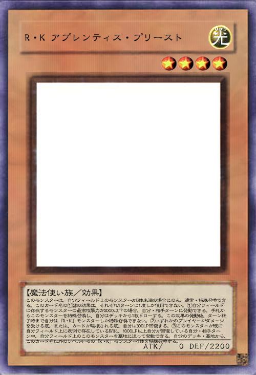 | このモンスターは、自分フィールド上のモンスターが5体未満の場合にのみ、通常・特殊召喚できる。このカード名の①③の効果は、それぞれ1ターンに1度しか使用できない。①自分フィールドに存在するモンスターの最高攻撃力が2000以下の場合、自分・相手ターンに発動できる。手札からこのモンスターを特殊召喚し、自分はデッキから1枚ドローする。この効果の発動後、ターン終了時まで自分は「R・K」モンスターしか特殊召喚できない。②いずれかのプレイヤーがダメージを受ける度、または、カードが破壊される度、自分は300LP回復する。③このモンスターが既に自分フィールド上に表側で存在している間に、1000LP以上自分が回復している自分・相手ターン中、自分フィールド上のこのモンスターを墓地に送って発動できる。自分のデッキ・墓地から、このカード名以外のレベル4~6の「R・K」モンスター1体を特殊召喚する。 | |||