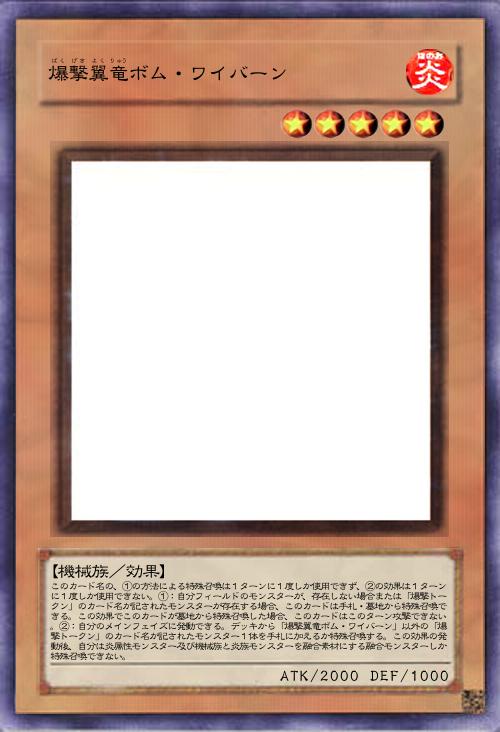 | このカード名の、①の方法による特殊召喚は1ターンに1度しか使用できず、②の効果は1ターンに1度しか使用できない。①:自分フィールドのモンスターが、存在しない場合または「爆撃トークン」のカード名が記されたモンスターが存在する場合、このカードは手札・墓地から特殊召喚できる。この効果でこのカードが墓地から特殊召喚した場合、このカードはこのターン攻撃できない。②:自分のメインフェイズに発動できる。デッキから「爆撃翼竜ボム・ワイバーン」以外の「爆撃トークン」のカード名が記されたモンスター1体を手札に加えるか特殊召喚する。この効果の発動後、自分は炎属性モンスター及び機械族と炎族モンスターを融合素材にする融合モンスターしか特殊召喚できない。 | |||