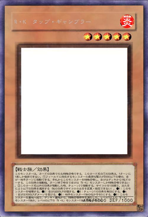 | このモンスターは、カードの効果でのみ特殊召喚できる。このカード名の①の効果は、1ターンに1度しか使用できない。①フィールドに存在するモンスターの最高攻撃力が2000以下の場合、自分・相手ターンに発動できる。手札からこのモンスターを特殊召喚し、自分はデッキから1枚ドローする。この効果の発動後、ターン終了時まで自分は「R・K」モンスターしか特殊召喚できない。②このカード名以外の効果が発動した時、チェーン2で発動する。サイコロを1回振り、出た目により以下の効果を適用する(他の効果でサイコロの出目を変更・指定できない)。●1:このモンスターを破壊する。●2:自分は500LP回復する。●3:チェーン1の効果を無効にする。●4:自分は1000LPダメージを受ける。●5:相手モンスター1体の攻か守を0にする。●6:このモンスターを墓地へ送り、デッキ・墓地から、特殊召喚条件を満たした、レベル7以上の「R・K」モンスター1体か、レベル5以下の「R・K」モンスター1体を特殊召喚する。 | |||