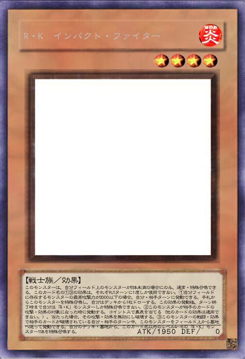 | このモンスターは、自分フィールド上のモンスターが5体未満の場合にのみ、通常・特殊召喚できる。このカード名の①③の効果は、それぞれ1ターンに1度しか使用できない。①自分フィールドに存在するモンスターの最高攻撃力が2000以下の場合、自分・相手ターンに発動できる。手札からこのモンスターを特殊召喚し、自分はデッキから1枚ドローする。この効果の発動後、ターン終了時まで自分は「R・K」モンスターしか特殊召喚できない。②このモンスターが相手のカードの攻撃・効果の対象になった時に発動する。コイントスで裏表を当てる(他のカードの効果は適用できない。)。当たった場合、その攻撃・効果を無効にし破壊する。③このモンスターの戦闘・効果で相手のカードが破壊されている自分・相手のターン中、このモンスターをフィールド上から墓地へ送って発動できる。自分のデッキ・墓地から、このカード名以外のレベル4~6の「R・K」モンスター1体を特殊召喚する。 | |||