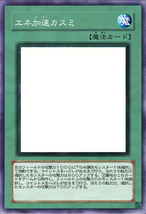 | 自分フィールドの攻撃力1000以下の水属性モンスター1体選択して発動できる。コイントスをハズレが出るまで行う。当たりの数だけ選択したモンスターの攻撃力は800アップする。②墓地のこのカードをゲームから除外し、フィールド上の攻撃力0のモンスター1体選択し、コイントスをハズレが出るまで行う。当たりの数だけ、選択したモンスターの攻撃力は700アップする。 | |||