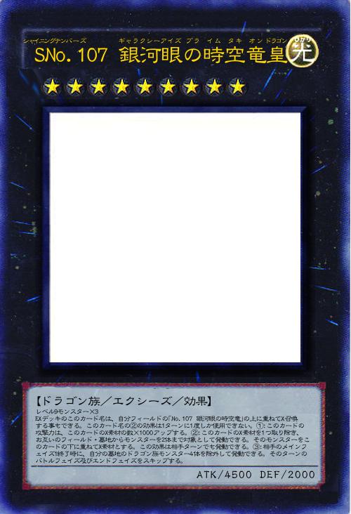 | レベル9モンスター×3 EXデッキのこのカード名は、自分フィールドの「No.107 銀河眼の時空竜」の上に重ねてX召喚する事もできる。このカード名の②の効果は1ターンに1度しか使用できない。①:このカードの攻撃力は、このカードのX素材の数×1000アップする。②:このカードのX素材を1つ取り除き、お互いのフィールド・墓地からモンスターを2体まで対象として発動できる。そのモンスターをこのカードの下に重ねてX素材とする。この効果は相手ターンでも発動できる。③:相手のメインフェイズ1終了時に、自分の墓地のドラゴン族モンスター4体を除外して発動できる。そのターンのバトルフェイズ及びエンドフェイズをスキップする。 | |||