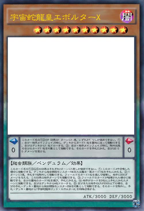 | このカード名の①③④⑤の効果はそれぞれ1ターンに1度しか使用できない。①:このカードがP召喚した場合に発動できる。デッキから爬虫類族モンスター1体または魔法・罠カード1枚を手札に加える。②:1ターンに1度、手札を1枚除外して発動できる。フィールドのカード1枚を選んで破壊し、相手に500ダメージを与える。この効果は相手ターンでも発動できる。③:フィールドのカードが破壊された場合に発動できる。自分の墓地のカード1枚を選び、手札に加える。④:相手がカードを3枚以上手札に加えたターンに発動できる。自分はデッキから4枚ドローする。⑤:自分または相手のLPが2000以下の場合、自分の手札・デッキ・墓地から爬虫類族モンスター5体を対象として発動できる。そのカードを除外し、手札・デッキ・墓地から「宇宙蛇龍神ゴッド・エボルターX」を特殊召喚する。 | |||