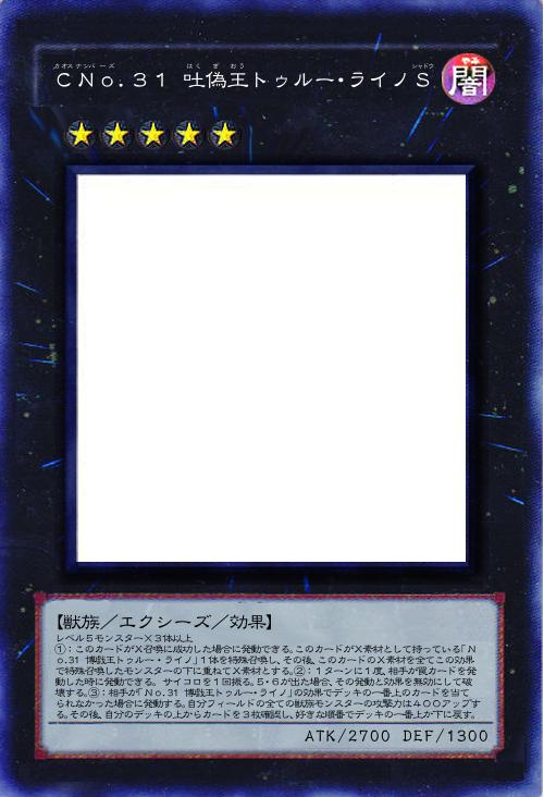 | レベル5モンスター×3体以上 ①:このカードがX召喚に成功した場合に発動できる。このカードがX素材として持っている「No.31 博戯王トゥルー・ライノ」1体を特殊召喚し、その後、このカードのⅩ素材を全てこの効果で特殊召喚したモンスターの下に重ねてX素材とする。②:1ターンに1度、相手が罠カードを発動した時に発動できる。サイコロを1回振る。5・6が出た場合、その発動と効果を無効にして破壊する。③:相手が「No.31 博戯王トゥルー・ライノ」の効果でデッキの一番上のカードを当てられなかった場合に発動する。自分フィールドの全ての獣族モンスターの攻撃力は400アップする。その後、自分のデッキの上からカードを3枚確認し、好きな順番でデッキの一番上か下に戻す。 | |||