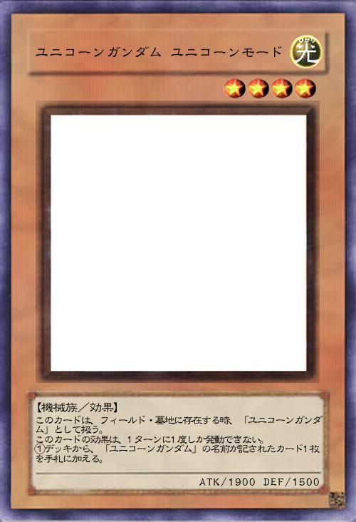 | このカードは、フィールド・墓地に存在する時、「ユニコーンガンダム」として扱う。 このカードの効果は、1ターンに1度しか発動できない。 ①デッキから、「ユニコーンガンダム」の名前が記されたカード1枚を手札に加える。 | |||