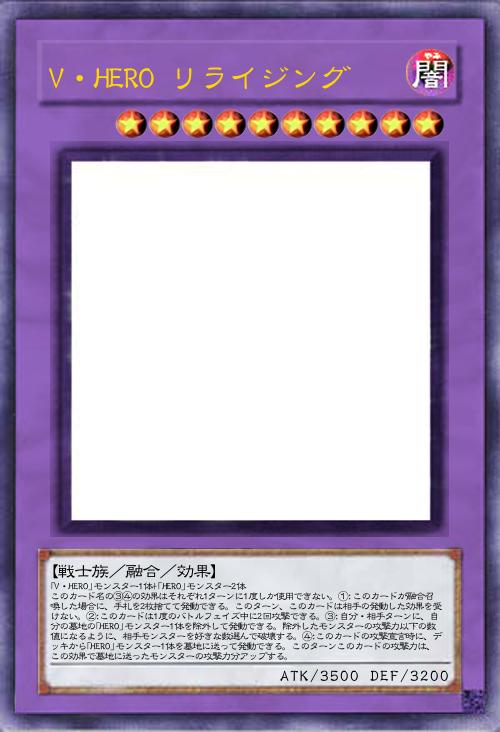 | 「V・HERO」モンスター1体+「HERO」モンスター2体 このカード名の③④の効果はそれぞれ1ターンに1度しか使用できない。①:このカードが融合召喚した場合に、手札を2枚捨てて発動できる。このターン、このカードは相手の発動した効果を受けない。②:このカードは1度のバトルフェイズ中に2回攻撃できる。③:自分・相手ターンに、自分の墓地の「HERO」モンスター1体を除外して発動できる。除外したモンスターの攻撃力以下の数値になるように、相手モンスターを好きな数選んで破壊する。④:このカードの攻撃宣言時に、デッキから「HERO」モンスター1体を墓地に送って発動できる。このターンこのカードの攻撃力は、この効果で墓地に送ったモンスターの攻撃力分アップする。 | |||