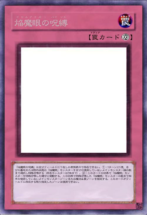 | 「焔魔眼の呪縛」は自分フィールドに1枚しか表側表示で存在できない。①:1ターンに1度、自分の墓地または除外状態の「焔魔眼」モンスターを自分の使用していないメインモンスター損の数まで選択し特殊召喚する(同名モンスターは1体まで)。②:このカードの効果で「焔魔眼」モンスターを特殊召喚した場合に発動する。この効果で特殊召喚した「焔魔眼」モンスターの数まで相手の使用していないメインモンスターゾーンまたは魔法&罠ゾーンを指定する。このカードがフィールドに存在する限り指定したゾーンは使用できない。 | |||
