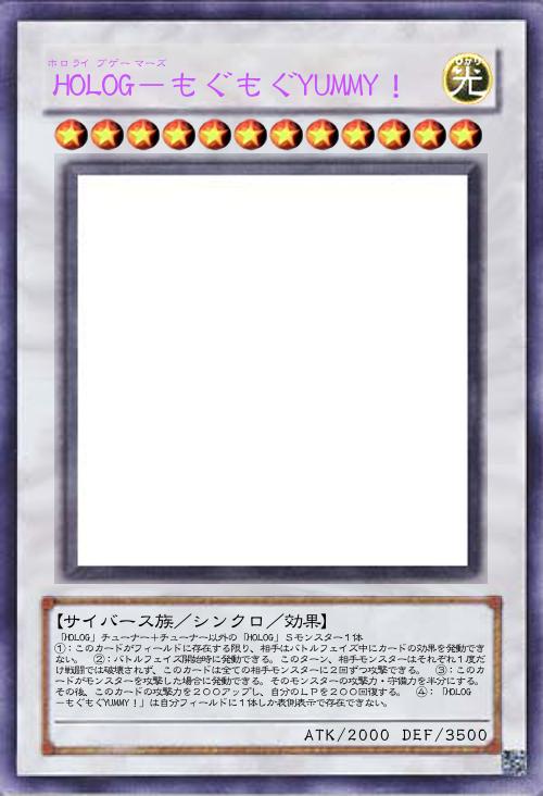 | 「HOLOG」チューナー+チューナー以外の「HOLOG」Sモンスター1体 ①:このカードがフィールドに存在する限り、相手はバトルフェイズ中にカードの効果を発動できない。 ②:バトルフェイズ開始時に発動できる。このターン、相手モンスターはそれぞれ1度だけ戦闘では破壊されず、このカードは全ての相手モンスターに2回ずつ攻撃できる。 ③:このカードがモンスターを攻撃した場合に発動できる。そのモンスターの攻撃力・守備力を半分にする。その後、このカードの攻撃力を200アップし、自分のLPを200回復する。 ④:「HOLOG-もぐもぐYUMMY!」は自分フィールドに1体しか表側表示で存在できない。 | |||