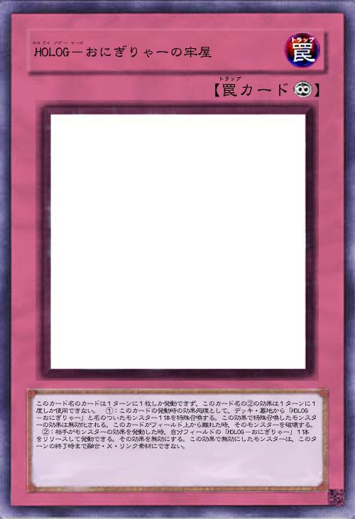 | このカード名のカードは1ターンに1枚しか発動できず、このカード名の②の効果は1ターンに1度しか使用できない。 ①:このカードの発動時の効果処理として、デッキ・墓地から「HOLOG-おにぎりゃー」と名のついたモンスター1体を特殊召喚する。この効果で特殊召喚したモンスターの効果は無効化される。このカードがフィールド上から離れた時、そのモンスターを破壊する。 ②:相手がモンスターの効果を発動した時、自分フィールドの「HOLOG-おにぎりゃー」1体をリリースして発動できる。その効果を無効にする。この効果で無効にしたモンスターは、このターンの終了時まで融合・X・リンク素材にできない。 | |||
