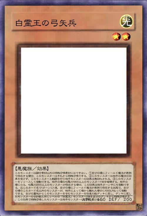 | このモンスターは融合素材以外の特殊召喚素材にはできない。①自分の場にフィールド魔法が表側で存在する場合、このモンスターは手札から特殊召喚できる。②このモンスターは相手の魔法の効果を受けず、このモンスターと戦闘を行う相手モンスターの効果は無効化される。③このモンスターをリリースして発動できる。相手の場の攻撃力1900以上のモンスター1体を破壊する。相手の場にのみ、攻撃力2000以上のモンスターが存在する場合、この効果は相手ターン中にも発動できる。④このカード名で1ターンに1度、自分の場にフィールド魔法が表側で存在する状態で、自分の場のこのカード名以外のモンスターが、相手によって場から離れた場合に1000LP払って発動できる。自分の墓地からこのモンスターを含むモンスターを任意の数デッキに戻し、デッキに戻したモンスターの合計数と同じレベルの「白霊王」モンスター1体を自分のデッキから特殊召喚する。この効果で特殊召喚したモンスターは相手モンスターの効果を受けない。 | |||