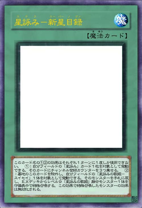| このカード名の①②の効果はそれぞれ1ターンに1度しか使用できない。 ①:自分フィールドの「星詠み」カード1枚を対象として発動できる。そのカードにチャンネル登録カウンターを3つ乗せる。 ②:墓地のこのカードを除外し、自分フィールドの「星詠みの歌姫- スイセイ」1体を対象として発動できる。そのモンスターを手札に戻し、EXデッキからレベル9「星詠みの歌姫」融合モンスター1体を守備表示で特殊召喚する。この効果で特殊召喚したモンスターの効果は無効化される。 | |||