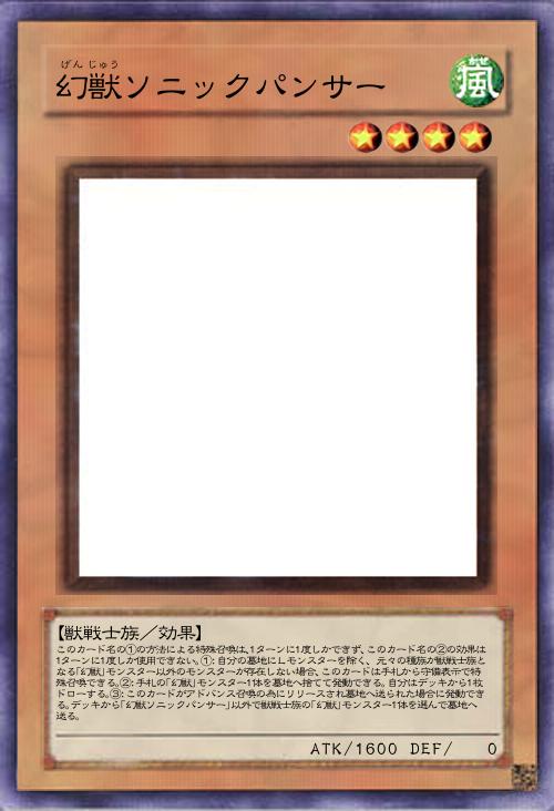 | このカード名の①の方法による特殊召喚は、1ターンに1度しかできず、このカード名の②の効果は1ターンに1度しか使用できない。①:自分の墓地にLモンスターを除く、元々の種族が獣戦士族となる「幻獣」モンスター以外のモンスターが存在しない場合、このカードは手札から守備表示で特殊召喚できる。②:手札の「幻獣」モンスター1体を墓地へ捨てて発動できる。自分はデッキから1枚ドローする。③:このカードがアドバンス召喚の為にリリースされ墓地へ送られた場合に発動できる。デッキから「幻獣ソニックパンサー」以外で獣戦士族の「幻獣」モンスター1体を選んで墓地へ送る。 | |||