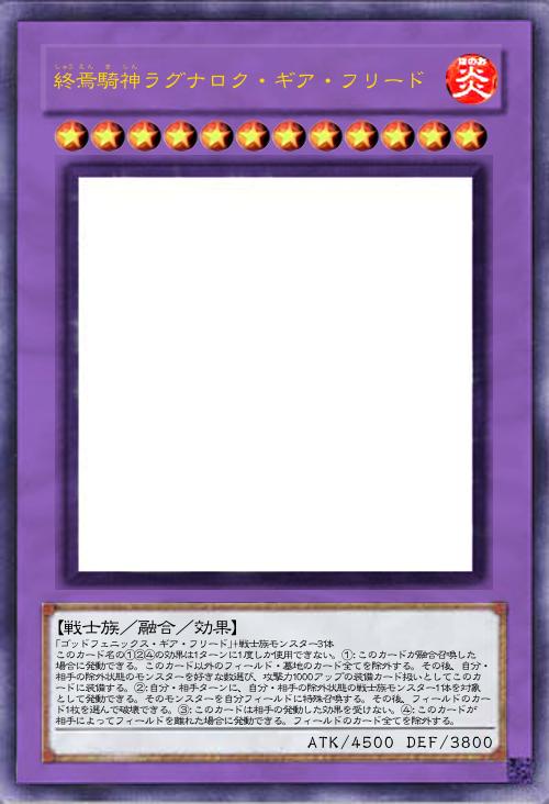 | 「ゴッドフェニックス・ギア・フリード」+戦士族モンスター3体 このカード名の①②④の効果は1ターンに1度しか使用できない。①:このカードが融合召喚した場合に発動できる。このカード以外のフィールド・墓地のカード全てを除外する。その後、自分・相手の除外状態のモンスターを好きな数選び、攻撃力1000アップの装備カード扱いとしてこのカードに装備する。②:自分・相手ターンに、自分・相手の除外状態の戦士族モンスター1体を対象として発動できる。そのモンスターを自分フィールドに特殊召喚する。その後、フィールドのカード1枚を選んで破壊できる。③:このカードは相手の発動した効果を受けない。④:このカードが相手によってフィールドを離れた場合に発動できる。フィールドのカード全てを除外する。 | |||