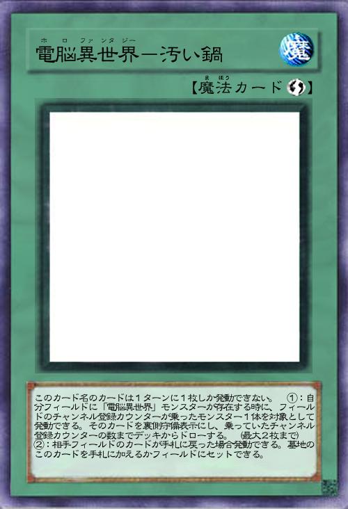 | このカード名のカードは1ターンに1枚しか発動できない。 ①:自分フィールドに「電脳異世界」モンスターが存在する時に、フィールドのチャンネル登録カウンターが乗ったモンスター1体を対象として発動できる。そのカードを裏側守備表示にし、乗っていたチャンネル登録カウンターの数までデッキからドローする。(最大2枚まで) ②:相手フィールドのカードが手札に戻った場合発動できる。墓地のこのカードを手札に加えるかフィールドにセットできる。 | |||