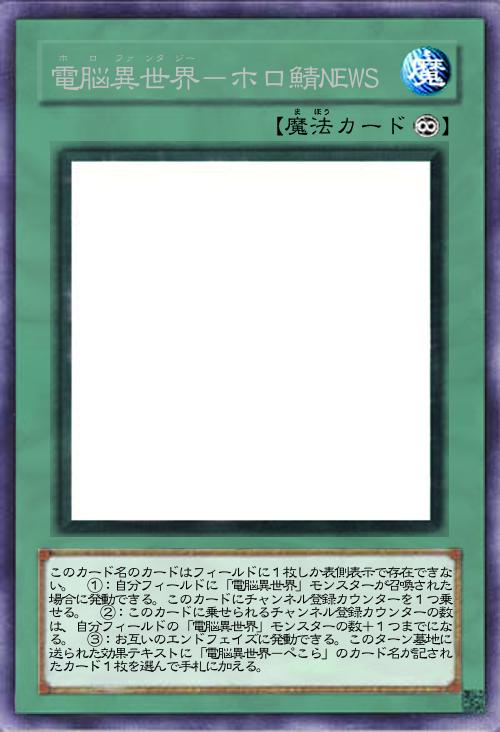 | このカード名のカードはフィールドに1枚しか表側表示で存在できない。 ①:自分フィールドに「電脳異世界」モンスターが召喚された場合に発動できる。このカードにチャンネル登録カウンターを1つ乗せる。 ②:このカードに乗せられるチャンネル登録カウンターの数は、自分フィールドの「電脳異世界」モンスターの数+1つまでになる。 ③:お互いのエンドフェイズに発動できる。このターン墓地に送られた効果テキストに「電脳異世界-ぺこら」のカード名が記されたカード1枚を選んで手札に加える。 | |||