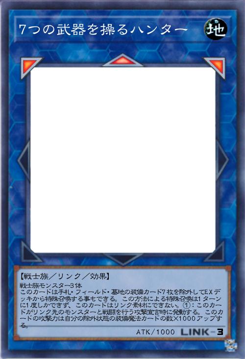 | 戦士族モンスター3体 このカードは手札・フィールド・墓地の装備カード7枚を除外してEXデッキから特殊召喚する事もできる。この方法による特殊召喚は1ターンに1度しかできず、このカードはリンク素材にできない。①:このカードがリンク先のモンスターと戦闘を行う攻撃宣言時に発動する。このカードの攻撃力は自分の除外状態の装備魔法カードの数×1000アップする。 | |||