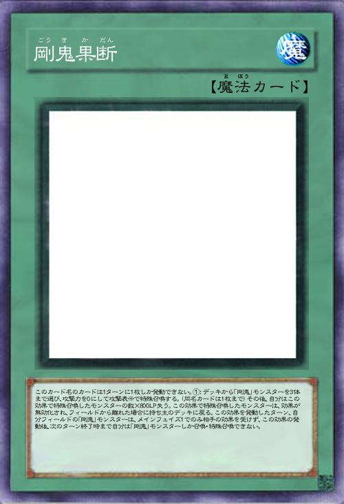 | このカード名のカードは1ターンに1枚しか発動できない。①:デッキから「剛鬼」モンスターを3体まで選び、攻撃力を0にして攻撃表示で特殊召喚する。(同名カードは1枚まで)その後、自分はこの効果で特殊召喚したモンスターの数×800LP失う。この効果で特殊召喚したモンスターは、効果が無効化され、フィールドから離れた場合に持ち主のデッキに戻る。この効果を発動したターン、自分フィールドの「剛鬼」モンスターは、メインフェイズ1でのみ相手の効果を受けず、この効果の発動後、次のターン終了時まで自分は「剛鬼」モンスターしか召喚・特殊召喚できない。 | |||
