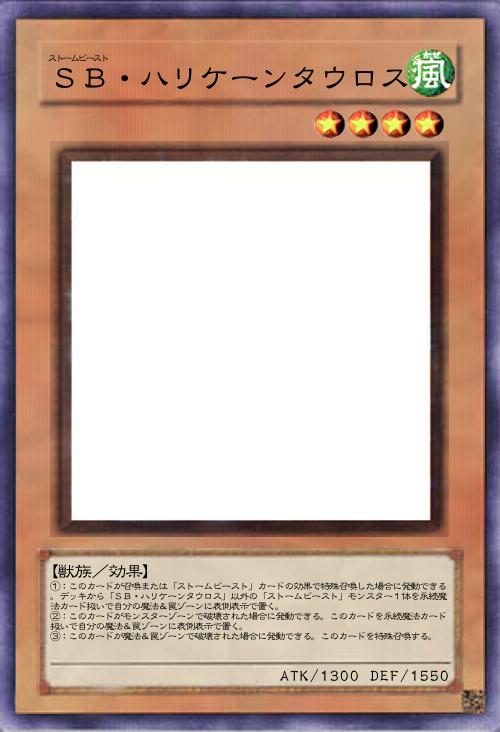 | ①:このカードが召喚または「ストームビースト」カードの効果で特殊召喚した場合に発動できる。デッキから「SB・ハリケーンタウロス」以外の「ストームビースト」モンスター1体を永続魔法カード扱いで自分の魔法&罠ゾーンに表側表示で置く。 ②:このカードがモンスターゾーンで破壊された場合に発動できる。このカードを永続魔法カード扱いで自分の魔法&罠ゾーンに表側表示で置く。 ③:このカードが魔法&罠ゾーンで破壊された場合に発動できる。このカードを特殊召喚する。 | |||