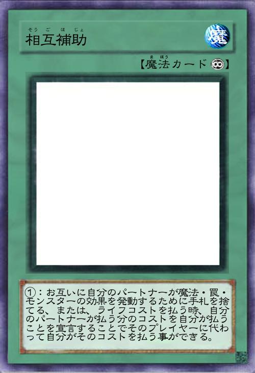 | ①:お互いに自分のパートナーが魔法・罠・モンスターの効果を発動するために手札を捨てる、または、ライフコストを払う時、自分のパートナーが払う分のコストを自分が払うことを宣言することでそのプレイヤーに代わって自分がそのコストを払う事ができる。 | |||