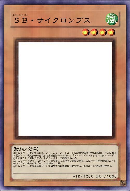 | ①:このカードが召喚または「ストームビースト」カードの効果で特殊召喚した場合、自分の魔法&罠ゾーンに表側表示で存在する永続魔法カード扱いの「ストームビースト」モンスターカード1枚を対象として発動できる。そのモンスターを特殊召喚する。 ②:このカードがモンスターゾーンで破壊された場合に発動できる。このカードを永続魔法カード扱いで自分の魔法&罠ゾーンに表側表示で置く。 ③:このカードが魔法&罠ゾーンで破壊された場合に発動できる。このカードを特殊召喚する。 | |||