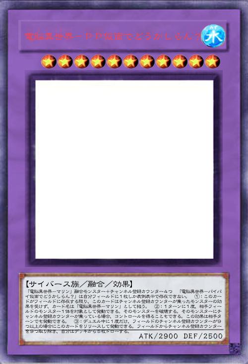 | 「電脳異世界-マリン」融合モンスター+チャンネル登録カウンター4つ 「電脳異世界-パイパイ仮面でどうかしらん?」は自分フィールドに1枚しか表側表示で存在できない。 ①:このカードがフィールドに存在する限り、このカードはチャンネル登録カウンターが乗ったモンスターの効果を受けず、カード名は「電脳異世界-マリン」として扱う。 ②:1ターンに1度、相手フィールドのモンスター1体を対象として発動できる。そのモンスターを破壊する。そのモンスターにチャンネル登録カウンターが乗っている場合、コントロールを得ることもできる。この効果は相手ターンでも発動できる。 ③:デュエル中に1度だけ、フィールドのチャンネル登録カウンターが9つ以上の場合にこのカードをリリースして発動できる。フィールドからチャンネル登録カウンターを9つ取り除き、自分はデッキから5枚ドローする。 | |||